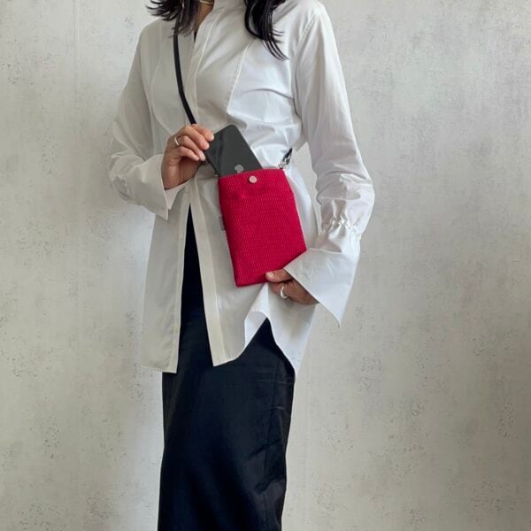 三河木綿刺し子織のコンパクトなスマホショルダー。コンパクトながら外ポケット付きで鍵などの小物収納もできて使い勝手は◎。ショルダーベルトは軽量、かつ摩擦の起こりにくいナイロン素材を採用しています。
