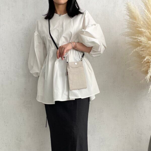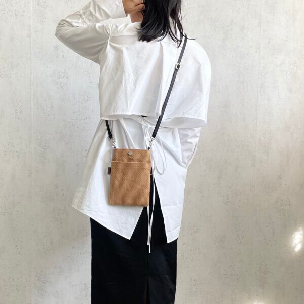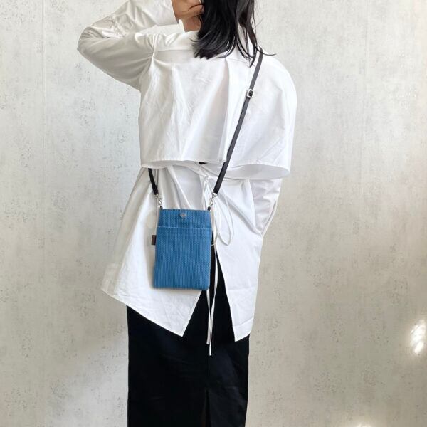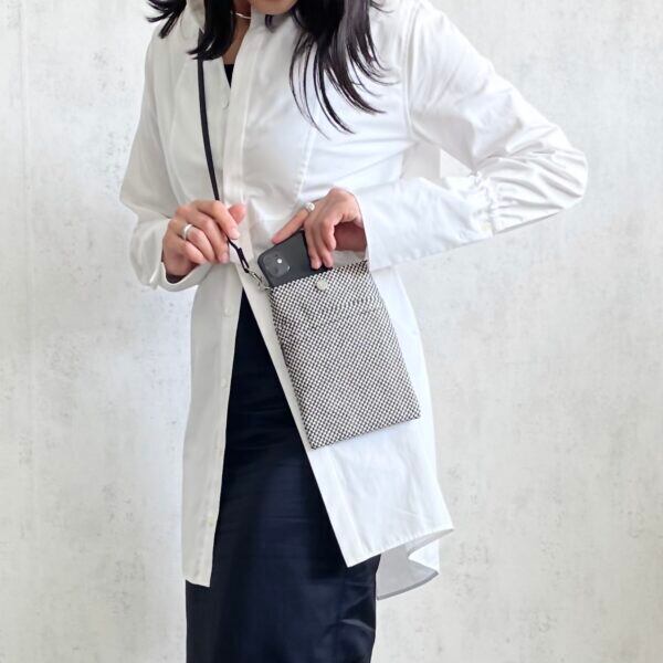 三河木綿刺し子織のコンパクトなスマホショルダー。コンパクトながら外ポケット付きで鍵などの小物収納もできて使い勝手は◎。ショルダーベルトは軽量、かつ摩擦の起こりにくいナイロン素材を採用しています。