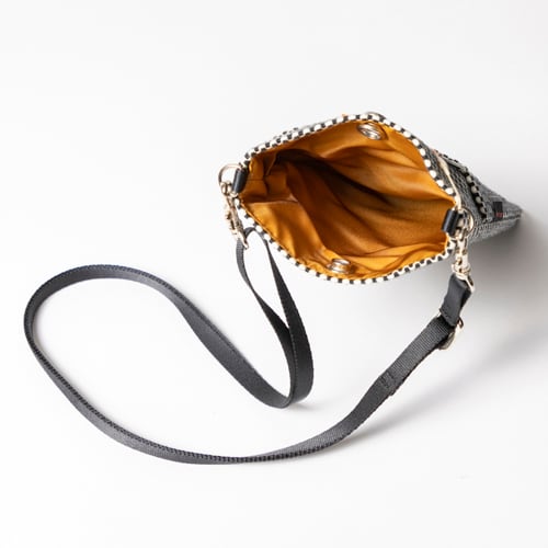 三河木綿刺し子織のコンパクトなスマホショルダー。コンパクトながら外ポケット付きで鍵などの小物収納もできて使い勝手は◎。ショルダーベルトは軽量、かつ摩擦の起こりにくいナイロン素材を採用しています。