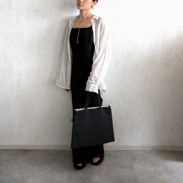 シンプルだからこそ使いやすい台形型のトートバッグ。13インチPCや、A4のファイルが縦にほどよく入るサイズ感です。マチは薄めなので、見た目にも軽やか。2連のショルダー紐が肩に優しいのもうれしいポイント。メインバッグとしてももちろん、サブバッグとしてもおすすめ。