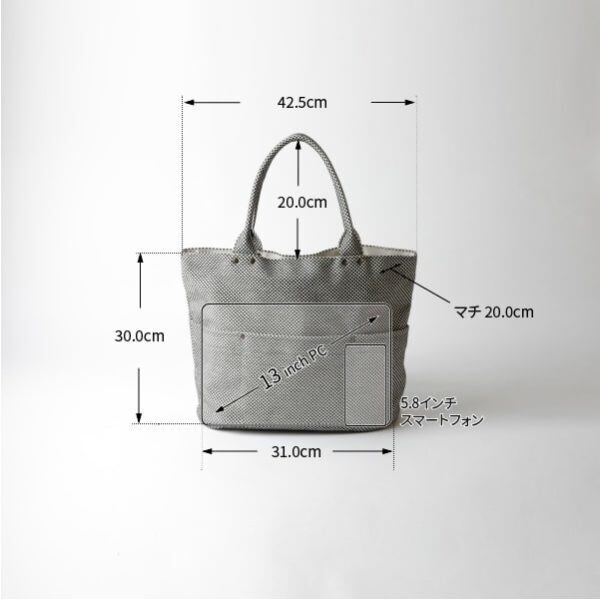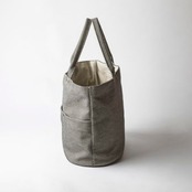 「バケツのように上から中身が見渡せる楕円形底」がコンセプトのトートバッグ。そのコンセプト通り、ガバッと口を開けば中に入れた物が一目瞭然で、物の探しやすさや取り出しやすさが抜群。それでいて、腕から下げると身体によりフィットし、しっくり収まるデザインに。バッグ前面には3つのポケット、内部にも仕切りポケット、ファスナー付きポケットが付き、機能性をも兼ね備えています。
