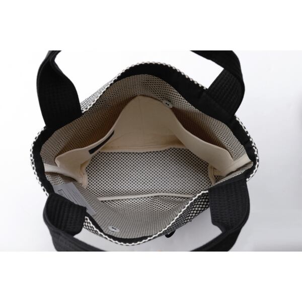 ワインボトルがすっぽり2、3本入るほどの深さと収納力があり、シンプルなデザインでありながら、ポイントに配したボタンを掛けたり、外したりすることで、デザインが大きく変わる個性的なバッグです。仕分け収納に便利な仕切りポケットもあり、機能性も備えています。