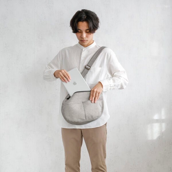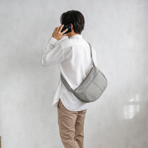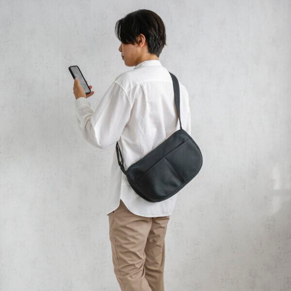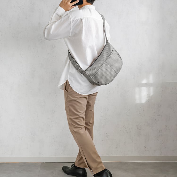体に自然と馴染む、「葉」をイメージしたフォルムが最大の特徴。財布やその他の小物など、必要なものは一通り入る大きさなので、休日のショッピングや旅先の観光地巡りのおともにも最適。フロントにはオープンポケットが2つ、本体内部にはオープンポケットが3つ付いているため、小物も整理して機能的に収納可能。ファスナー仕様の大きめ開閉口なので中身がたっぷり入れられて旅行のときも安心。