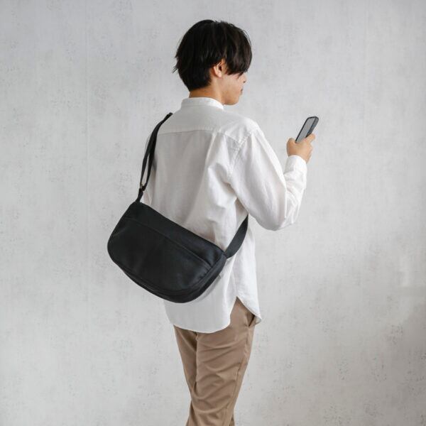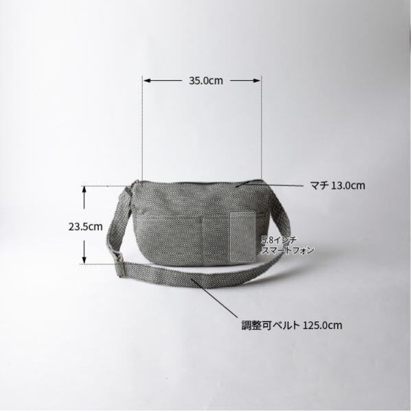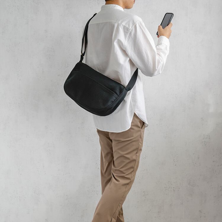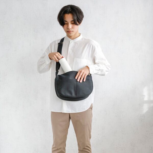 体に自然と馴染む、「葉」をイメージしたフォルムが最大の特徴。財布やその他の小物など、必要なものは一通り入る大きさなので、休日のショッピングや旅先の観光地巡りのおともにも最適。フロントにはオープンポケットが2つ、本体内部にはオープンポケットが3つ付いているため、小物も整理して機能的に収納可能。ファスナー仕様の大きめ開閉口なので中身がたっぷり入れられて旅行のときも安心。