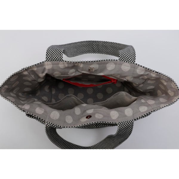 バッグ表面の刺し子織の大きなリボンと、不規則な水玉柄の裏地が最大の特徴。外からチラリと見える裏地が印象的で、個性が光るバッグに仕上がっています。内側に3つ、外側に2つのポケットを備えていて、機能性も備えています。