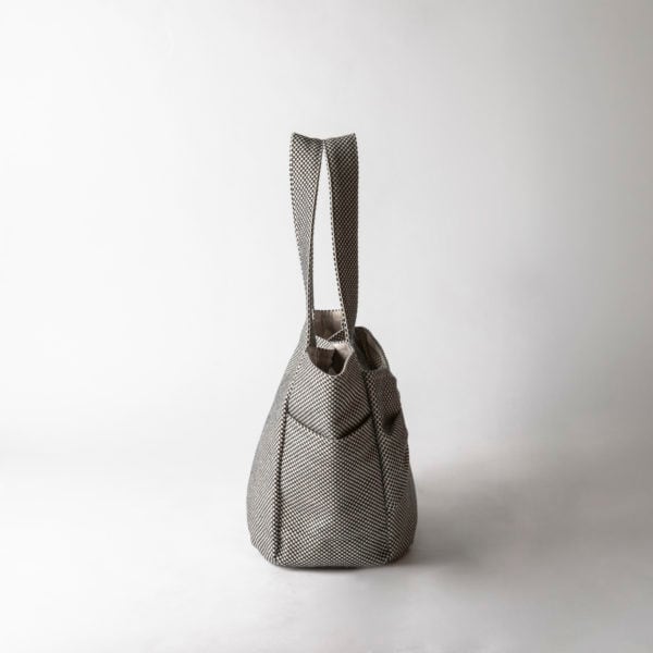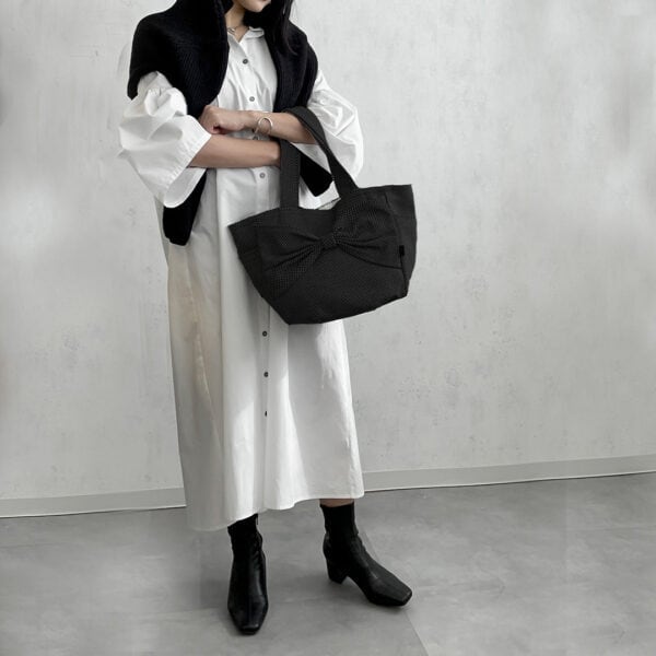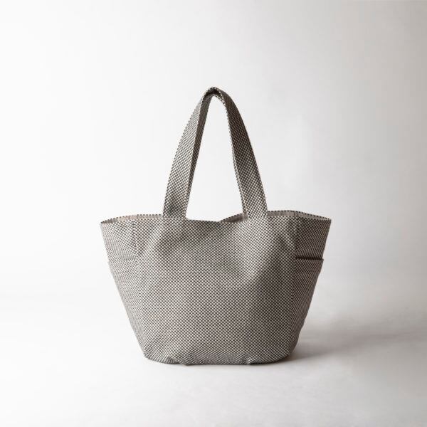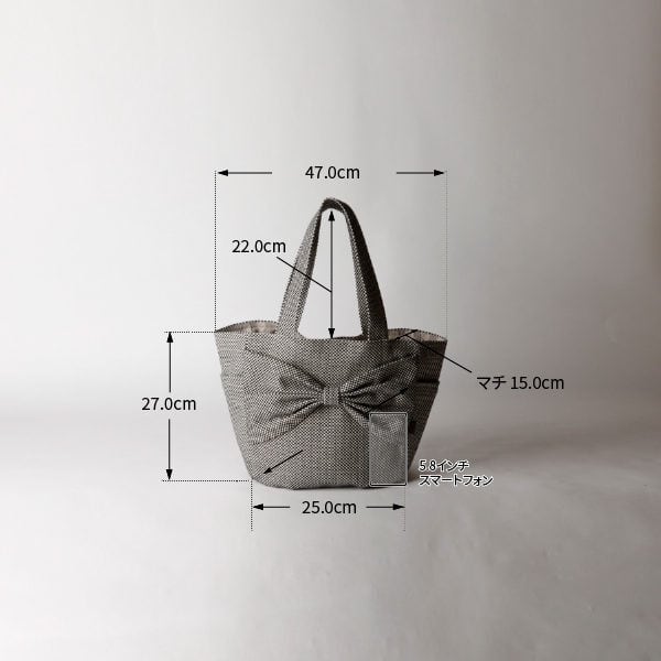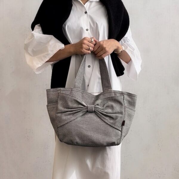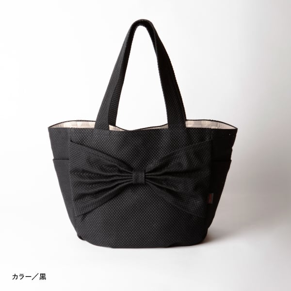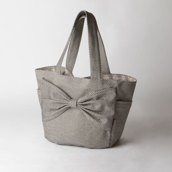 バッグ表面の刺し子織の大きなリボンと、不規則な水玉柄の裏地が最大の特徴。外からチラリと見える裏地が印象的で、個性が光るバッグに仕上がっています。内側に3つ、外側に2つのポケットを備えていて、機能性も備えています。