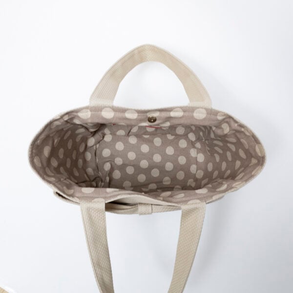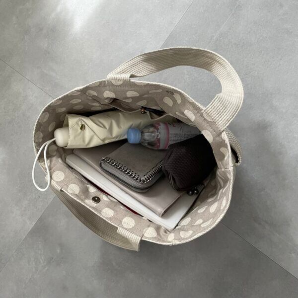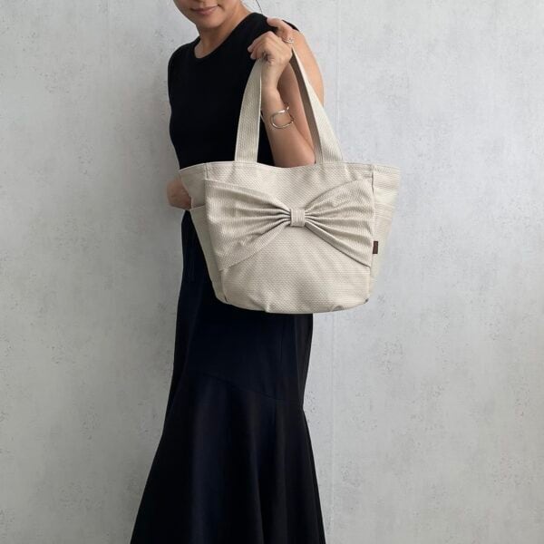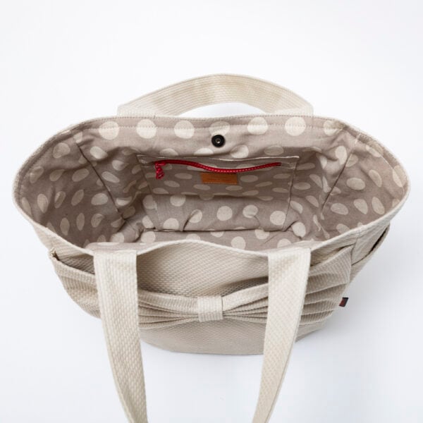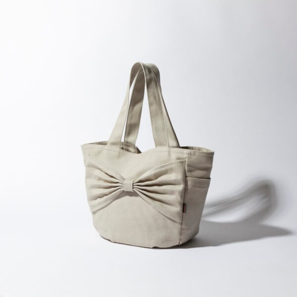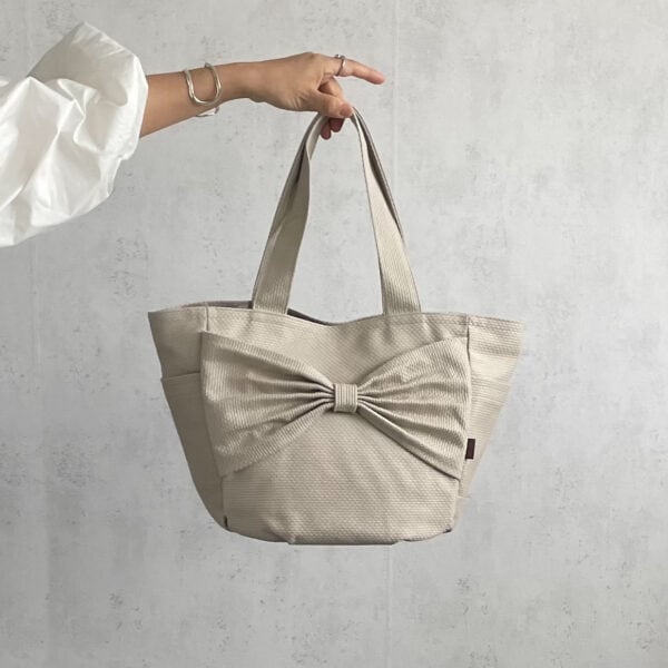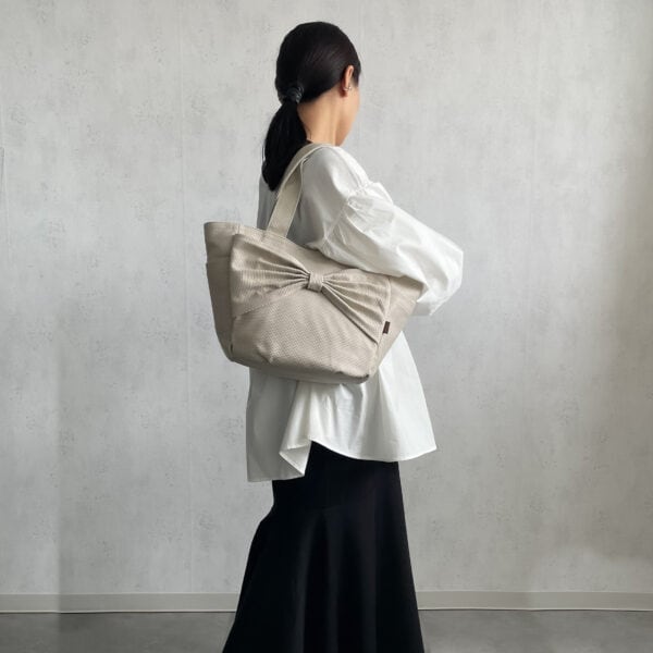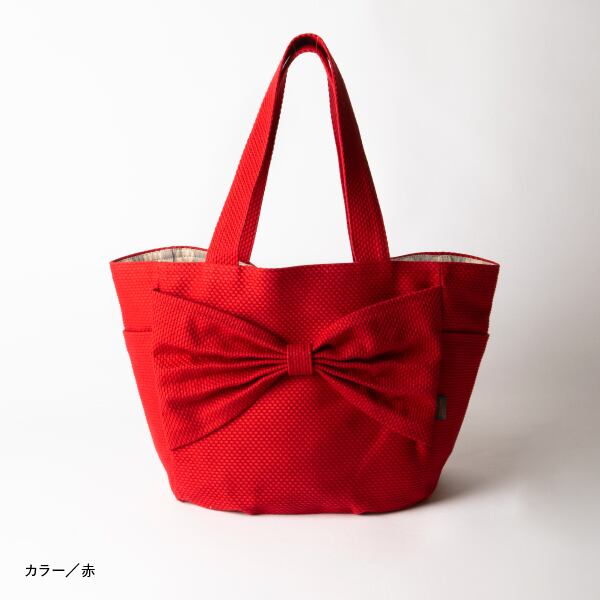 バッグ表面の刺し子織の大きなリボンと、不規則な水玉柄の裏地が最大の特徴。外からチラリと見える裏地が印象的で、個性が光るバッグに仕上がっています。内側に3つ、外側に2つのポケットを備えていて、機能性も備えています。